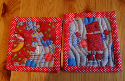 I'm already planning the next quilt, which will have a steampunk, cogs and gears theme, and possibly a robot or two. These two experiments have been made into coasters.